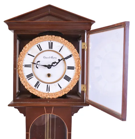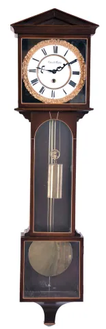 Laterndluhr, nine glass mahogany case, two part Roman numeral enamel dial with gilt bezel, brass pendulum and weight