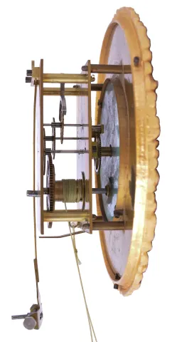 case 20th century, two glasses missing, lower door loose, dial with hairlines and repairs, movement ticks, weight with dents