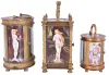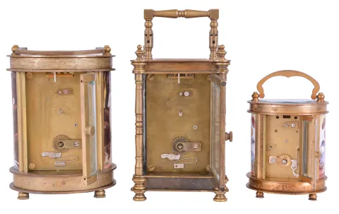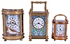 Carriage clocks- 3 (Three), made in China, all with brass cases set with enamel decorated panels, 8 day time only movements, late 20th century