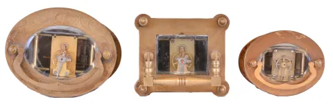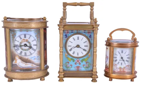 Carriage clocks- 3 (Three), made in China, all with brass cases set with enamel decorated panels, 8 day time only movements, late 20th century running, dimensions of larger oval clock listed