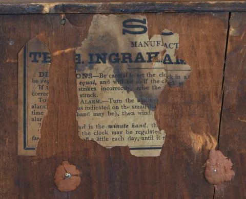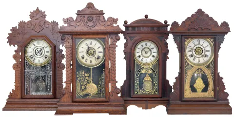 Clocks- 4 (Four): (1) E. Ingraham & Co., Bristol, Conn., "Sun", 8 day, time, strike and alarm spring brass movement shelf clock, c1891 (2) Waterbury Clock Co., Waterbury, Conn., 8 day, time, strike and alarm brass movement shelf clock, c1885 (3) New Haven