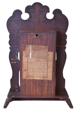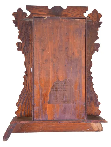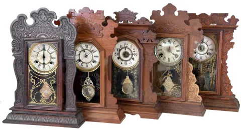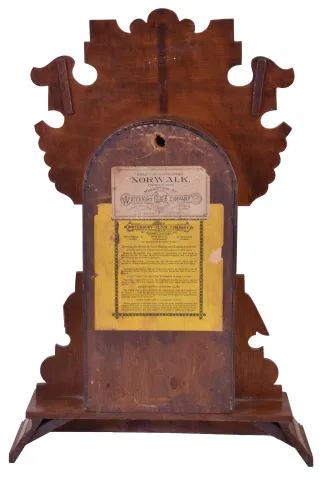 Clocks- 5 (Five): (1) Sessions Clock Co., Forestville, Conn. Kitchen style shelf clock with a spring driven 8 day time and strike movement in an oak case, c1900. (2) New Haven Clock Co., New Haven, Conn. "American Wringer Co Eclipse" shelf clock with a spring driven 8 day time and strike movement in an oak case, c1890. (3) Waterbury Clock Co., Waterbury, Conn., "Norwalk" shelf clock with an 8 day spring driven time and strike movement in a walnut case, c1890. (4) Waterbury Clock Co., Waterbury, Conn., "Idaho" shelf clock with an 8 day spring driven time and strike movement in an oak case, c1900. (5) Unidentified shelf clock with an 8 day spring driven time, strike and alarm movement in a walnut case, c1900. (1) The case finish is old and darkened. The paper dial has darkened with age. The hands may be replacements. The right decorative side piece to the case is missing. Ht. 22.5in (2) The case is missing part of the top piece as well as the lower left base return. Ht. 20.5in. (3) The case appears to have a later finish. The hands and dial are original. The case door glass is missing. Ht. 22.3in. (4) The original finish has darkened with age. The paper dial and hands are original. The decorative door glass is original. Ht. 22in. (5) The case has some original finish. The hands and dial are old and may be original. The alarm mechanism is missing and the gong may be a replacement, Ht. 22in.