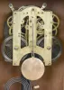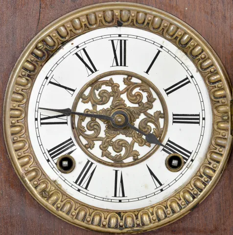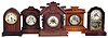 (1) Inlayed mahogany and mahogany veneered case in original finish has a couple of dings and small piece missing on the right back edge. Original ivorine dial in nice condition. Hands are replacements. Ht 13.75" (2) Rosewood and mahogany veneered case in an old finish has a small chip on the base left side back edge. Painted dial looks original. Original hands and tablet. Clean label inside the case. Ht 14" (3) Partially refinished walnut case has a separation at the lower right corner seam. Paper dial is very clean and may be replaced. Minute hand looks replaced. Ht 14" (4) Walnut case in original finish has some scattered loss to the surface. Paper dial has been replaced. Original hands. Dark label on the back of the case. Ht 16.5" (5) Refinished oak case in nice condition. Original paper dial has some stains and wear at the slow / fast setting. Original hands. Nice label on back of the case. Ht 13.75"