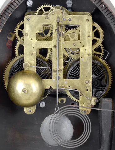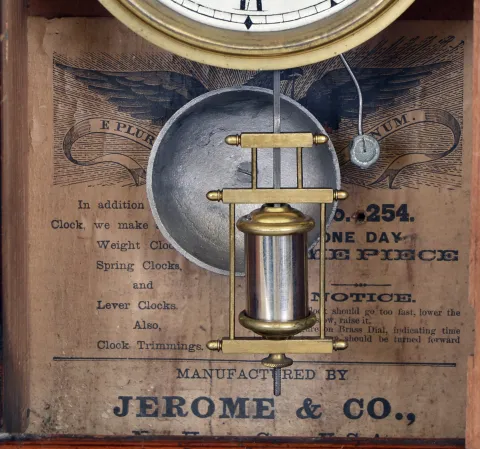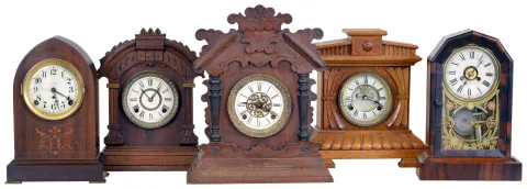 Clocks- 5 (Five): (1) Seth Thomas Clock Co., Thomaston, Conn., "Prospect No. 11", 8 day, time and strike spring brass movement shelf clock. (2) Jerome & Co., (New Haven Clock Co.), New Haven, Conn., 30 hour, time and alarm spring brass movement cottage