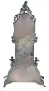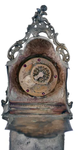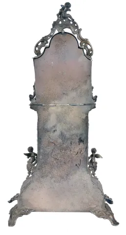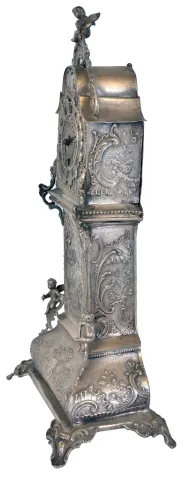 Desk clock in miniature tall clock form, silver case with bombe base and arch top, decorated with rococo style, repousse ornament, and with three cast putti, containing a thirty hour, continental verge fusee watch movement, 19th century case with a few minor dents and polish residue, running
