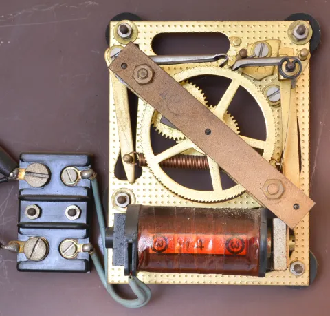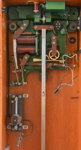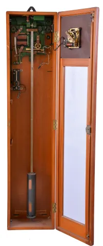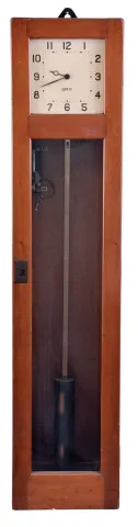 Gents of Leicester, England, C7 Pul- Syn- Etic master clock, mahogany case with glazed door, Arabic numeral white painted dial, and invar pendulum with cylindrical ball, the pendulum receiving impulse every thirty seconds from a falling gravity arm, as in