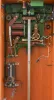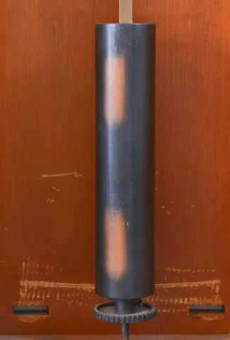Gents of Leicester, England, C7 Pul- Syn- Etic master clock, mahogany case with glazed door, Arabic numeral white painted dial, and invar pendulum with cylindrical ball, the pendulum receiving impulse every thirty seconds from a falling gravity arm, as in the Synchronome master clocks case dirty and with bumps and scrapes, movement appears to be complete, but the clock was not tested under power