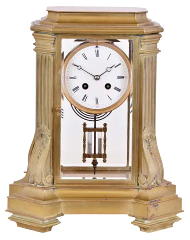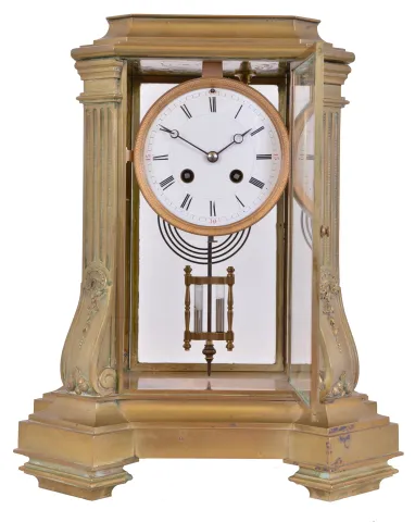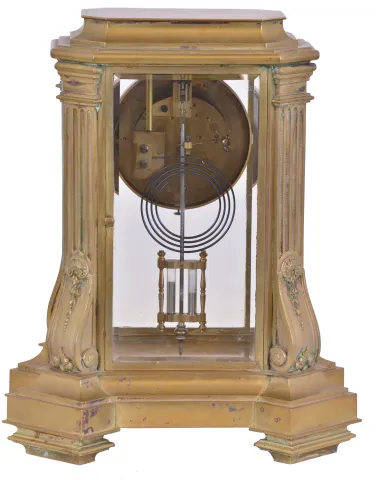 France, for Tiffany & Co., crystal regulator, architectural case with canted corners on a stepped and molded base, the corners decorated with fluted pilasters on inverted corbels, and supporting the stepped, molded top, Roman numeral white enamel dial, blued steel Breguet style hands, 8 day time and strike pendule de Paris movement marked "Tiffany & Co.", with two vial mercury pendulum case with tarnish, staining, and polish residue, dial good, hands with minor oxidation, movement ticks and strikes, pendulum replaced