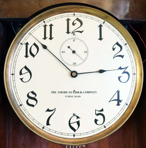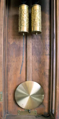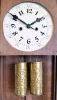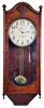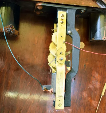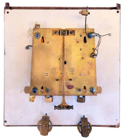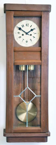 the trademarked German movement appears complete, driven by two fancy brass weights, but was not tested and is sold as is. The case, 11.5 x 34 x 5.5 in, could be improved or replaced. The case, 16 x 47 x 7 in, of the American Clock Co. timepiece is in very nice condition with a soft glossy finish and no losses or damage. The small electrically- wound movement is numbered B10233 and shows patent dates of 1899 and 1900. Its pendulum is modern and incorrect. The top holders for the dry cells are corroded, and we did not test the operation