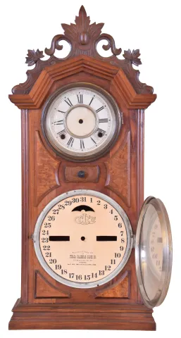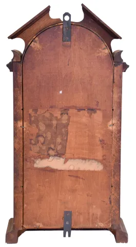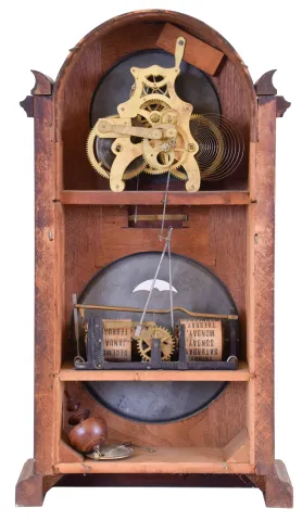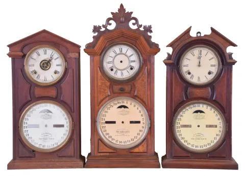 (1) Walnut case with contrasting burl panels in an old finish is in nice condition. Time dial looks replaced. Paper calendar dial is replaced. The upper movement is inside the case, but is now detached from the seatboard. Calendar movement is missing. Hands and pendulum are missing. Ht 25" (2) Walnut case has lost most of its original finish. Side moldings on the upper right and left are missing. Original paper time dial is stained with surface abrasion. Original hands. Original calendar dial has some stains. Calendar movement is missing. Backboard is missing. Ht 22.5" (3) Walnut case has remains of original finish. Original paper time dial has surface abrasion. Original paper calendar dial has age darkened. Original time hands. Calendar hand is missing. Original calendar rollers have age darkened. Original finial inside the case. ht 23"