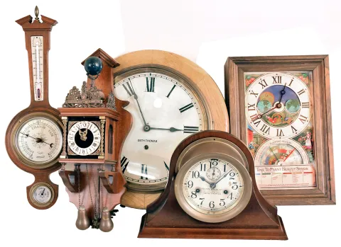 Clocks- 4 (Four) plus barometer / thermometer: Seth Thomas 8 day time only wood gallery clock; Seth Thomas, for Kelvin White, 30 hour brass ship's- bells marine clock on newer mahogany cradle; small modern time and strike German Zaandam two weight wall