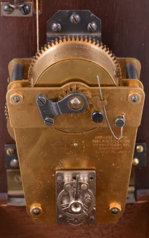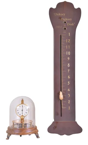 Clocks- 2 (Two): (1) Horolovar Clock Co., Bronxville, New York, "Dickory, Dickory, Dock", 8 day, time spring brass lever movement reproduction mouse clock, c1970 (2) Horolovar Clock Co., Bronxville, New York, "Briggs Rotary", 8 day, time spring brass movement reproduction novelty timepiece, c1980 (1) The case has its original dark finish, but needs a little cleaning from being in storage. The mouse is complete with his tail. The balance wheel movement seems to tick okay, but will need to be serviced. The brass numbers for 11 and 12 are missing and a little damage on top edge. Take care at home that the wall hanging nail does not extend enough into the clock to hit the balance wheel directly in front of its hole. Ht 24 1/2" (2) Like- new original condition complete with glass dome in original polystyrene container. Rotating ball propelled by a thin turning finger; never great timekeepers but interesting novelties. Instruction sheet is missing. 7" tall.