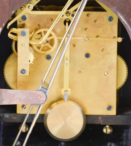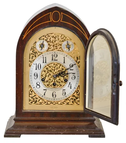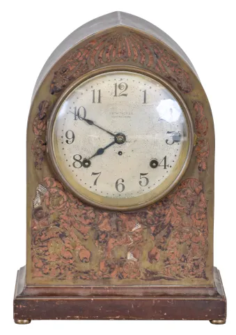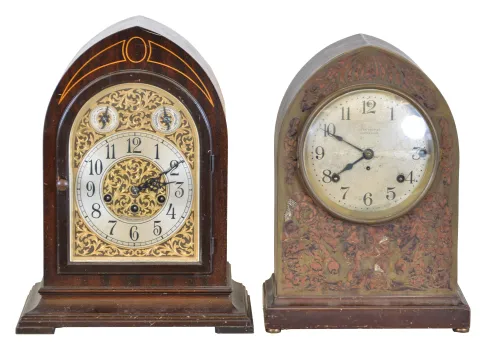 Clocks- 2 (Two): (1) Seth Thomas Clock Co., Thomaston, Conn., "Chime Clock No. 70", 8 day, time and strike spring brass movement chime clock, c1928 (2) Seth Thomas Clock Co., Thomaston, Conn., "Chime Clock No. 64", 8 day, time and strike spring brass movement 5- bell Sonora Chime mantel clock, c1914. This clock measures the same size as the number 64, but has a nice pierced brass front inlayed with burl walnut. (1) Inlayed mahogany and mahogany veneered case in original finish has some minor dings and scratches. Original silvered and gilt dial is in very nice condition. Original hands and pendulum. Ht 14.25" (2) Mahogany and mahogany veneered case in original finish has some dings and scratches on the base. The pierced brass front was either polished bright or may have had a silver wash. Original silvered dial is tarnished with surface scratches. Original hands. Ht 15"