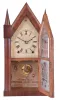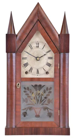 Brewster & Ingrahams, Bristol, Conn., Sharp Gothic or steeple shelf clock with a spring driven 8 day time and strike movement in a mahogany veneered case.