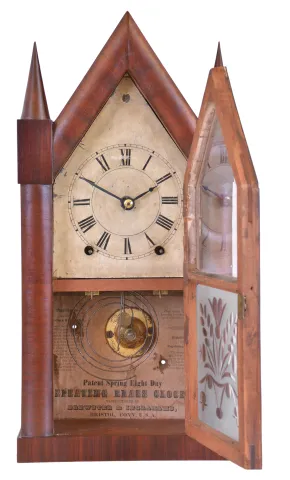 Brewster & Ingrahams, Bristol, Conn., Sharp Gothic or steeple shelf clock with a spring driven 8 day time and strike movement in a mahogany veneered case. The case, in excellent condition and has been refinished at some point. The movement has a rack & snail striking and cast iron barrels to enclose the springs. The original painted dial has darkened with age. The hands are original. The top door glass is original. The bottom door glass is an original acid etched glass with copper wheel engraving.