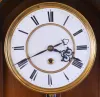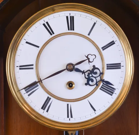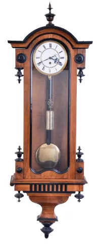 Austria, hanging regulator, walnut case with ebonized moldings, drops, and finial, Roman numeral, two piece white enamel dial, blued steel hands, 8 day timepiece movement with dead beat escapement, brass pendulum with wooden rod, and brass weight