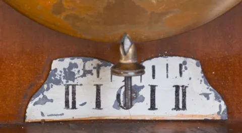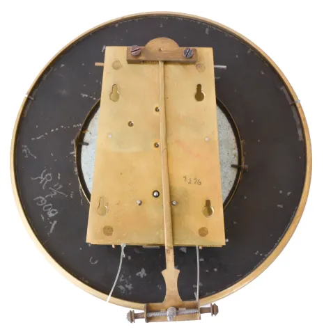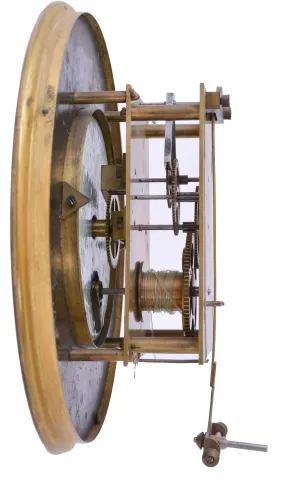 case with a few minor splits and separations, dial good, hands with minor discoloration, movement dirty, ticks and strikes, pendulum with minor tarnish, weight with tarnish