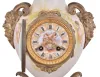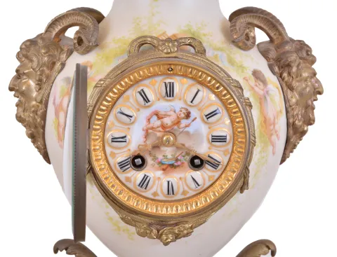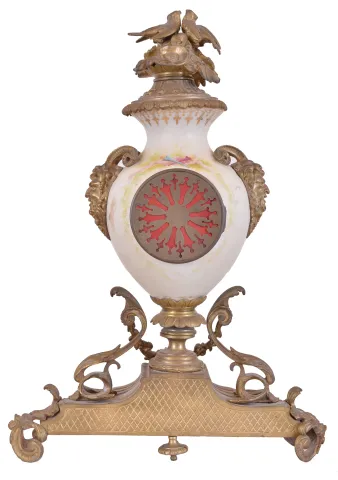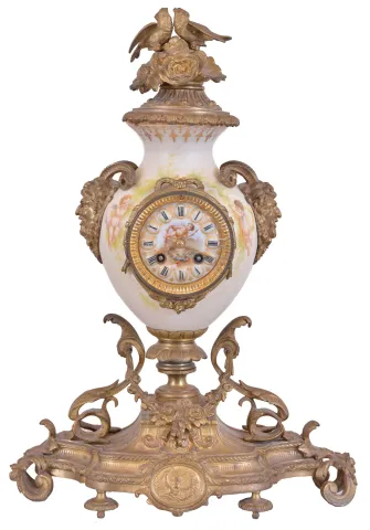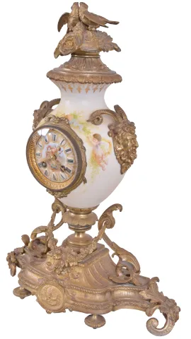 France, mantel clock, the vase form porcelain case with painted putti flanking the dial, satyr mask handles, the top with flowers and a pair of birds, all on a gilt base with foliate ornament, porcelain dial with Roman numerals, gilding, and central