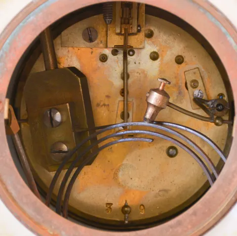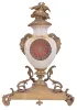France, mantel clock, the vase form porcelain case with painted putti flanking the dial, satyr mask handles, the top with flowers and a pair of birds, all on a gilt base with foliate ornament, porcelain dial with Roman numerals, gilding, and central polychrome putto, gilt hands, and 8 day time and strike pendule de Paris movement gilding with wear and losses, porcelain good, dial and hands very good, movement ticks and strikes, dirty, gong bent, and with minor rust