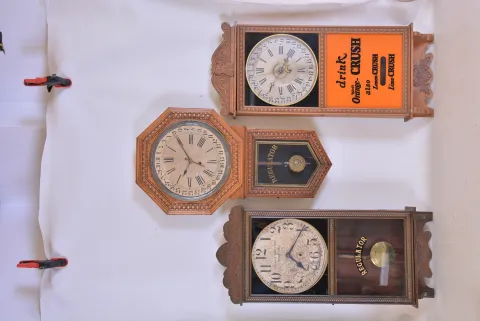 (1) The case has been nicely refinished. The paper dial is for a Waterbury clock and needs to be replaced with the proper Ingraham dial. The hands appear to be original. The stenciled door glass is original. Ht. (2) The case has been refinished. The original paper dial has stains in several areas. The hands are original. The door glasses are replacements. Ht. 38in. (3) The clock was made for the "Greater New York Clock Co" as indicated on the dial. The original paper dial is stained. The hands and pendulum are original. The "Regulator" logo has been restored. The movement is signed. Ht. 35.5in.