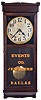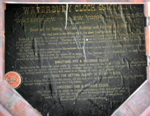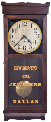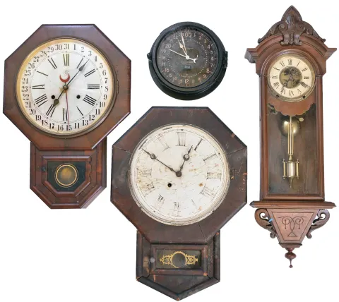 Clocks- 5 (Five): (1) Unmarked short drop school clock with a spring driven 8 day timepiece movement in a rosewood veneered case, c1890. (2) Waterbury, Conn., short drop hanging clock with a spring driven 8 day time, strike and simple calendar mechanism in a rosewood veneered case, c1890. (3) New Haven Clock Co., New Haven, Conn. No.3043 wall clock in a mahogany finish with a 8 day time only movement, c1917. (4) F. Kroeber Clock Co., NY, "Regulator No. 31" wall clock with a spring driven 8 day time and strike movement in a walnut case with carved trim, c1875. (5) Chelsea Clock Co., Boston, Mass., 8 day, spring brass lever movement in a bakelite case wardroom timepiece, c1954. (1) There is no bezel. The dial and hands are worn. The case has veneer loss. Ht. 23.75in. (2) The case retains an original finish with some veneer loss around the door. The paper dial is in very good condition with a small area of wear near the center post. The hands appear to be original. Ht. 23.5in. (3) The case has old finish but will need some repair. Nice glass made for Dallas jewelers. Original paper dial. Missing beat scale. Movement will need service. Ht. 42in. (4) The case was painted white & has been refinished and stained a very dark walnut color. The dial center is absent. The movement is a Seth Thomas, as Kroeber used Seth Thomas movements. The door glass is cracked and needs to be replaced. Ht 33in. (5) The movement is missing the winding arbor and barrel. Ht. 10.3in.