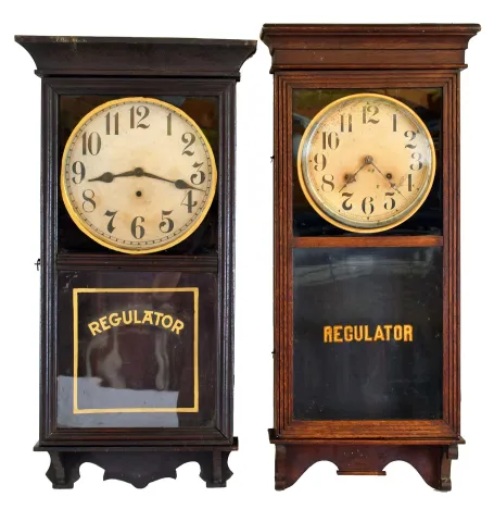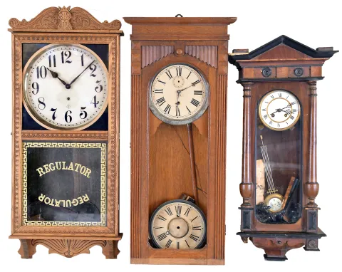 Clocks- 5 (Five): (1) Wm. L. Gilbert Clock Co., Winsted, Conn. "University" wall hanging clock with an 8 day spring driven timepiece movement in a mahogany case, c1913. (2) Sessions Clock Co., Forestville, Conn., "Regulator No. 1" wall hanging clock with an 8 day time and strike movement in an oak case, c1908. (3) Wm. L. Gilbert Clock Co., Winsted, Conn., unidentified wall hanging clock with an 8day timepiece movement in an oak case, c1910. (4) Wm. L. Gilbert Clock Co., Winsted, Conn, "Regulator No. 10" wall hanging clock with a double weight 8 day timepiece movement in an oak case, c1890. (5) German R- A Regulator wall clock with a spring driven 8 day time and strike movement, c1900. (1) The case has its original finish which has darkened with age, The original paper dial shows signs of wear. The hands are original. The lower glass is original with the Regulator strip added later. Ht. 34in. (2) The case retains its original finish. The glasses are original. The paper dial is showing some spotting. The hands are original. Ht. 35.5in. (3) The case has lost its original finish. The paper dial and hands are original. The glasses appear replaced. Ht. 35in. (4) The case is missing much of the top and the base. The correct dial, weights and door glass are absent. Ht. 34in. (5) There is damage to the case. One glass side panel is missing. The porcelain dial and hands are original and in good condition. Ht.33in.