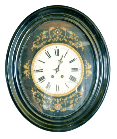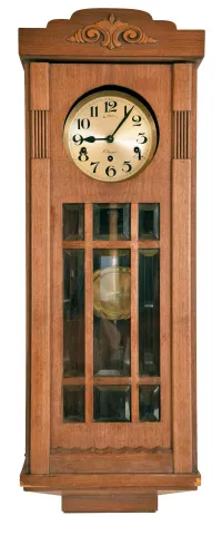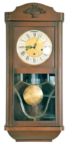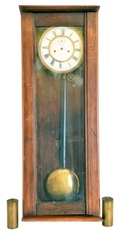 Clocks- 6 (Six) wall hanging: (1) Time only Vienna regulator in walnut case, c1890; (2) German chiming spring driven box clock, c1960; (3) partial German time and strike spring driven, c1900; (4) French baker's clock, c1890; (5) German time and strike