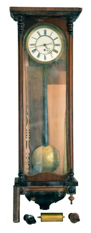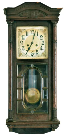 Clocks- 6 (Six) wall hanging: (1) Time only Vienna regulator in walnut case, c1890; (2) German chiming spring driven box clock, c1960; (3) partial German time and strike spring driven, c1900; (4) French baker's clock, c1890; (5) German time and strike spring driven box clock, c1910; (6) German chiming spring driven box clock, c1930 clocks are in various states, from significant restoration needed to ready to hang. Sold "as is".