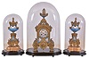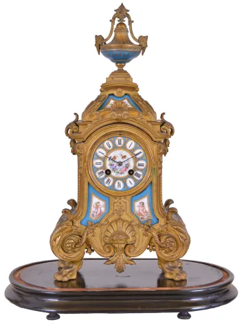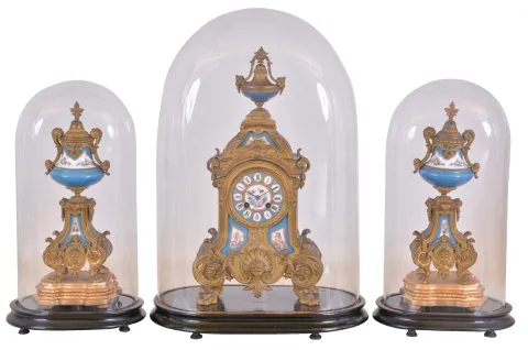 France, mantel clock with garniture, ornate, gilt spelter clock case on paw feet, and with polychrome porcelain panels, Roman numeral porcelain dial, blued steel hands, 8 day time and strike pendule de Paris movement, with matching, porcelain mounted side pieces, each with its own gilt wooden base, all with glass domes dirty, losses to gilding, a few very small losses to clock case, panels and dial good, movement ticks and strikes, pendulum missing rating nut, garniture dirty, and with minor losses to gilding, garniture bases with gold paint and losses to gesso, ebonized bases and domes good