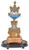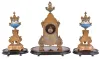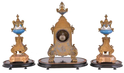 France, mantel clock with garniture, ornate, gilt spelter clock case on paw feet, and with polychrome porcelain panels, Roman numeral porcelain dial, blued steel hands, 8 day time and strike pendule de Paris movement, with matching, porcelain mounted side