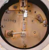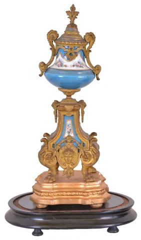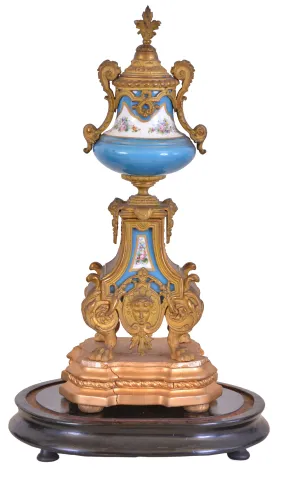 dirty, losses to gilding, a few very small losses to clock case, panels and dial good, movement ticks and strikes, pendulum missing rating nut, garniture dirty, and with minor losses to gilding, garniture bases with gold paint and losses to gesso, ebonized bases and domes good