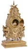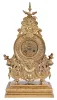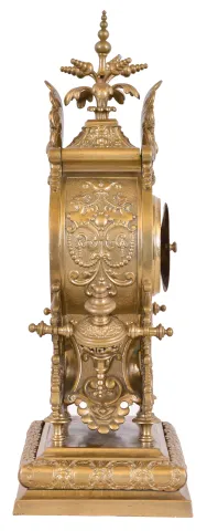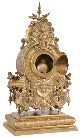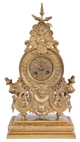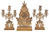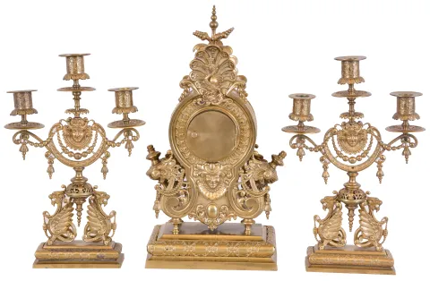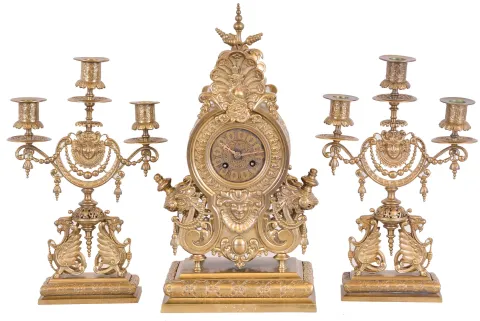 Lenzkirch, Germany, a three piece mantel garniture, ornate cast case with gryphons, masks, and a riot of indescribable ornament, with a pair of three arm candelabra similarly decorated, Roman numeral brass dial, 8 day time and strike movement, serial #414911 minor tarnish, minor bends, dial lacking silver, ticks and strikes, strike hammer loose, clock dimensions listed