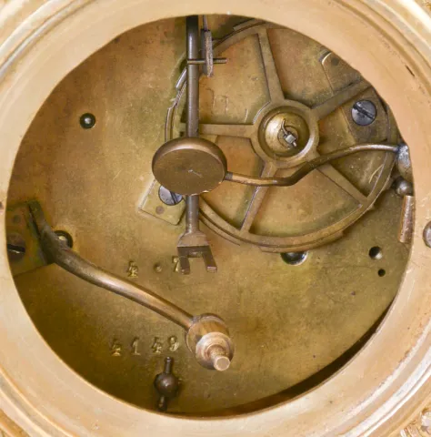 minor tarnish, minor bends, dial lacking silver, ticks and strikes, strike hammer loose, clock dimensions listed