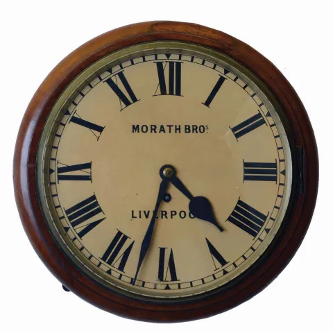 English, 8 day, spring fusee brass movement gallery clock sold by Morath Brothers, Liverpool, England. Mahogany case in nice condition in an old and possibly original finish. Off- white dial looks to be original with a couple tiny chips at the edge near 9 o'clock. Original hands. Heavy brass plate chain- driven fusee movement.