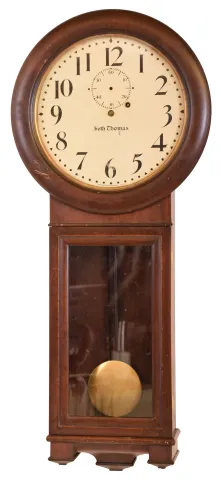 Clocks- 2 (Two): (1) Seth Thomas Clock Co., Thomaston, Conn., "Globe", 8 day, spring brass movement wall timepiece. (2) Seth Thomas Clock Co., Thomaston, Conn., "Regulator No. 2", 8 day, weight brass movement wall timepiece. (1) Oak case under a "lovely" coat of yellow paint. Original painted dial has minor wear to some of the numbers. Original hands. Original gilding on the bottom door molding is intact. Ht 32.25" (2) Mahogany case in original finish has some surface scratches and abrasions. Original painted dial has a couple chips. Original pendulum. Hands, weight and door lock are missing. Ht 36.5"