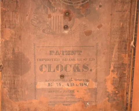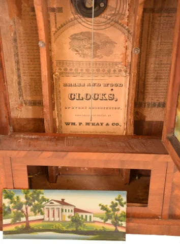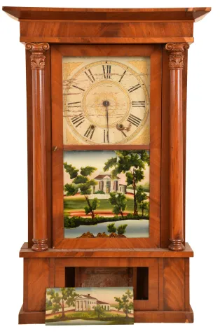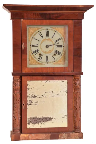 Clocks- 2 (Two): (1) Wm. P. Mckay & Co., Boston, Mass., 8 day, time and strike weight brass movement column & cornice shelf clock. (2) E. W. Adams, Seneca Falls, New York, 30 hour, time and strike weight wood movement shelf clock. Mahogany and mahogany veneered case in an old finish has some veneer loss on the base and the cornice. Original painted dial has scattered paint loss. Original center tablet with some restoration. Bottom tablet by Tom Moberg. Hour hand is missing. Clean label inside. Ht 33.5" (2) Refinished mahogany and mahogany veneered case has loss on the base and a small piece on the cornice. There are several pieces of veneer off the base inside the case. Original painted dial is very nice for its age. Old mirror, but not original. Minute hand is missing. Ht 32"