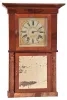 Mahogany and mahogany veneered case in an old finish has some veneer loss on the base and the cornice. Original painted dial has scattered paint loss. Original center tablet with some restoration. Bottom tablet by Tom Moberg. Hour hand is missing. Clean label inside. Ht 33.5" (2) Refinished mahogany and mahogany veneered case has loss on the base and a small piece on the cornice. There are several pieces of veneer off the base inside the case. Original painted dial is very nice for its age. Old mirror, but not original. Minute hand is missing. Ht 32"