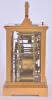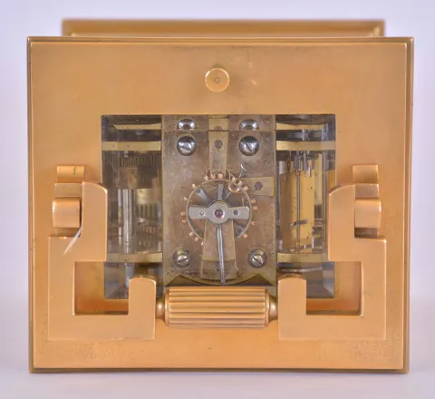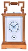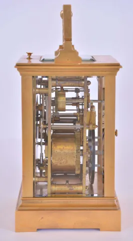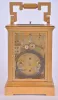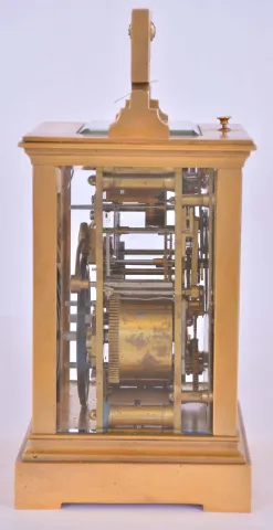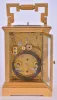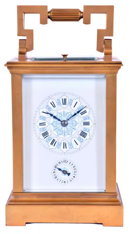 France, hour repeating carriage clock, gilt Anglaise case with bevelled glasses, Roman numeral enamel dial with faux cartouches, and Arabic alarm chapter below, blued steel distaff style hands, 8 day time, strike, and alarm movement with lever platform, repeating the hour on demand gilding restored, right side glass with minor flake, a few minor flakes / chips on back glass, minute hand repaired, alarm hand replaced, dial good, movement dirty and with spot of verdigris, running, the alarm, striking, and repeating functioning correctly, repeat button sticks in the down position, repeat lever stud bent, would benefit from service