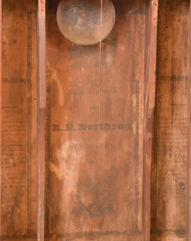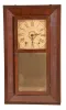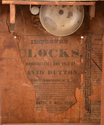 Clocks- 2 (Two): (1) R. E. Northrop, New Haven, Conn, "Carved Column and Splat" shelf clock with a weight driven 30 hour time and strike wooden works movement in a mahogany case with carved paw feet and pineapple finials, c1835. (2) David Dutton, Mount Vernon, NH, bevel shelf clock with a 30 hour weight driven time and strike wooden works movement in a mahogany and rosewood case, c1845. (1) The case has a heavy finish which is not original. The top pieces (splat, chimneys and returns) look right, but may have come from another clock, The original painted dial shows some loss and discoloration. The hands are original. Ht. 35.5in. (2) The case has some original finish. The painted wood dial has some horizontal cracking and other areas of loss. The hands are original. The door glass and mirror are original. Ht. 26.25in.