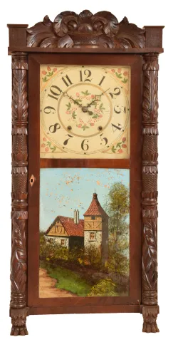 Clocks- 2 (Two): (1) R. E. Northrop, New Haven, Conn, "Carved Column and Splat" shelf clock with a weight driven 30 hour time and strike wooden works movement in a mahogany case with carved paw feet and pineapple finials, c1835. (2) David Dutton, Mount