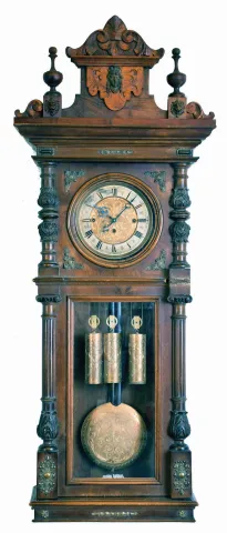 Vienna regulator hanging wall clock with inside paper label of Felix Prihoda, Wien, walnut 8 day 3 weight quarter striking trademarked movement the entire bottom portion of the ornate case is absent, and the carved and turned top crest has a different wood stain color. The dial, weights and pendulum have a matching pattern, although the silvered chapter ring of the dial has tarnish and wear. Some minor case trim pieces also are missing. The complex movement appears complete but was not tested and is sold as is.