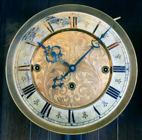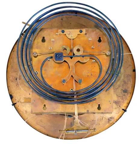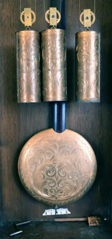 the entire bottom portion of the ornate case is absent, and the carved and turned top crest has a different wood stain color. The dial, weights and pendulum have a matching pattern, although the silvered chapter ring of the dial has tarnish and wear. Some minor case trim pieces also are missing. The complex movement appears complete but was not tested and is sold as is.