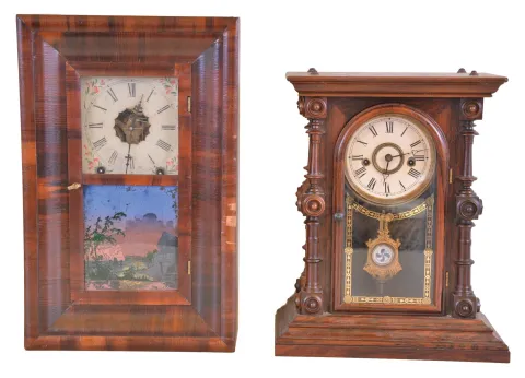 Clocks- 2 (Two): (1) New Haven Clock Co., New Haven, Conn., 8 day, time and strike spring brass movement miniature OOG shelf clock, c1870 (2) Welch, Spring & Co., Forestville, Conn., "Cary, V.P.", 8 day, time and strike spring brass movement shelf clock, c1880 (1) Rosewood veneered case in an old finish has some loss on the outer band and a couple repairs on the door. Original painted dial has some loss at the winding arbors and at the mounting screws. Original hands. Original tablet has some loss. Dark label inside the case. (2) Rosewood and rosewood veneered case appears refinished. The entire top decoration for the case is missing. Original dial pan now has a paper dial. Original hands, tablet and pendulum. Remains of the original label on the back of the case. Ht 15"