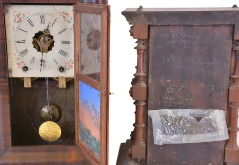 (1) Rosewood veneered case in an old finish has some loss on the outer band and a couple repairs on the door. Original painted dial has some loss at the winding arbors and at the mounting screws. Original hands. Original tablet has some loss. Dark label inside the case. (2) Rosewood and rosewood veneered case appears refinished. The entire top decoration for the case is missing. Original dial pan now has a paper dial. Original hands, tablet and pendulum. Remains of the original label on the back of the case. Ht 15"