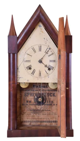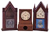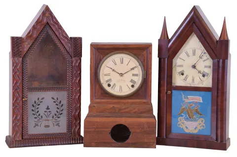 Clocks- 3 (Three): (1) Forestville Mfg. Co., (J.C. Brown), Forestville, Conn., 8 day, time and strike spring brass movement shelf clock. (2) William S. Johnson, New York, 30 hour, time and strike fusee- spring brass movement Sharp Gothic or steeple clock. (3) Forestville Mfg. Co., (J.C. Brown), Forestville, Conn., Ripple molding Sharp Gothic or steeple case. (1) Rosewood veneered has lost most of its original finish, but is in otherwise nice condition. Original dial has been repainted. Original hands. The bottom access door is missing. Ht 14.5" (2) Mahogany veneered case in an old finish is in nice condition. Original painted dial has scattered paint loss. The tablet looks to have restored. The hands are old, but a later style. Ht 20" (3) Mahogany veneered case has an old finish and a handsome pie crust ripple. Frosted tablet is modern. No movement, dial, hands, pendulum or finials. Ht 20"