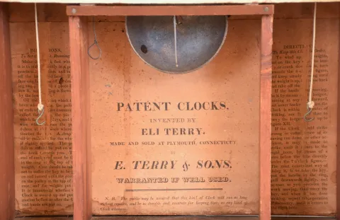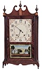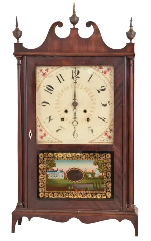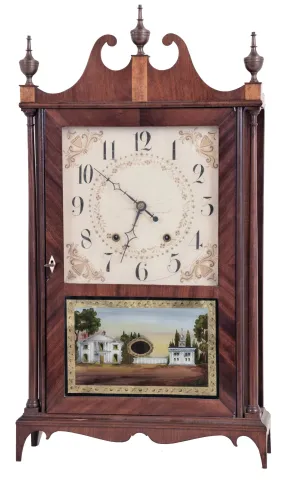 Clocks- 2 (Two): (1) E. Terry & Sons, Plymouth, Conn. 30 hour, time and strike weight wood movement pillar & scroll shelf clock. (2) E. Terry & Sons, Plymouth, Conn., 30 hour, time and strike weight wood movement pillar & scroll shelf clock. (1) Partially refinished mahogany and mahogany veneered case has a repair to the right scroll and some damage to the right skirt tip. The lower half of the backboard has been replaced with a piece of hardboard. Period dial has scattered wear to the numbers and decoration and has been redrilled. Original hands. Tablet is a modern replacement. Modern finials. (2) Mahogany and mahogany veneered case has an old finish, small damaged area near the door lock and minor damage at the left skirt tip. Original painted dial has a little wear and some paint loss in the center. Original hands, Finials and tablet are modern.