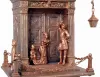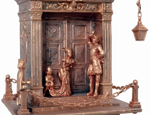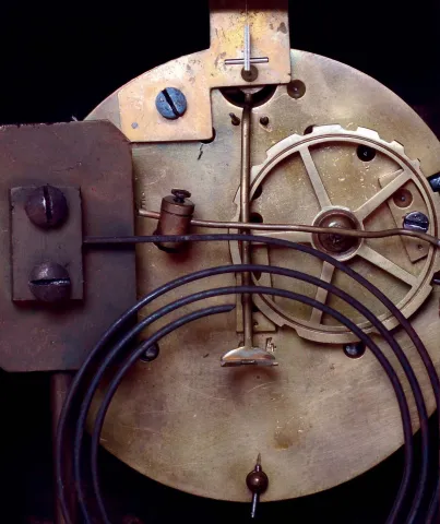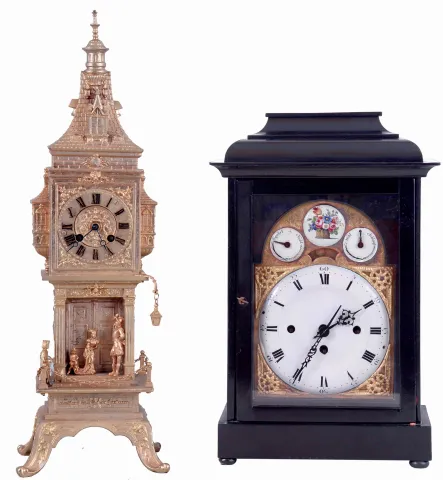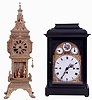 Clocks- 2 (Two): The first an Austrian 3 train bracket clock, probably 2 day, in ebonized wooden case, composite, engraved brass and enamel dial, engraved brass quarter striking movement with verge escapement, c1800, and a French architectural mantel clock, gilt case, Roman numeral dial, 8 days time and strike movement, c1880 both with restored cases, Austrian clock movement with rust, not running, Ht 16 3/4", French clock case dirty, minor losses to gilding, ticks and strikes, Ht 21"