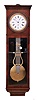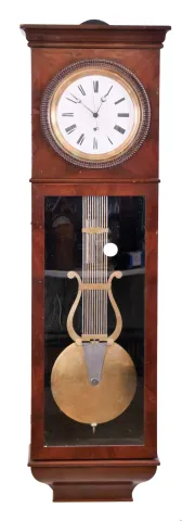 the case retains its original finish with veneer lifting and cracks on front and a patch to the left of the dial and loss to the rear left. The dial has extensive damage, which has been inpainted. There may have been an additional trim piece on bottom. The back is felt lined. The pendulum is in good condition and untouched.