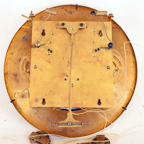 the case of this large and ornate wall clock needs some attention, gluing, removal of glue overages, and fabrication of three lower side trim pieces which held two bottom finials. One side glass panel is absent, and the white enamel dial has just a single small hairline. The complex movement appears complete but was not tested and is sold as is. There is an old patina on the brass weights and pendulum