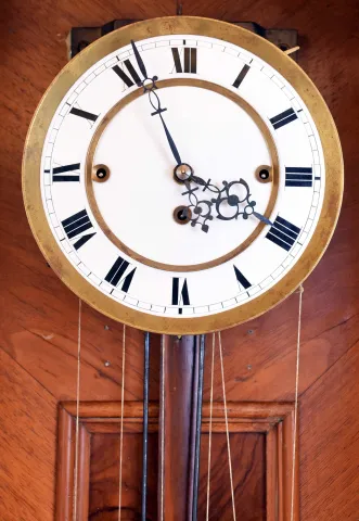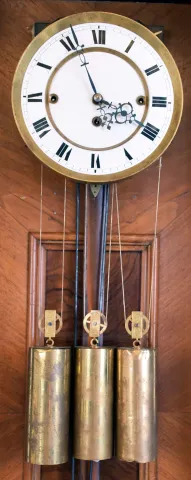 Vienna Regulator, unsigned German walnut 3 weight quarter striking 8 day large hanging wall clock, c1880 the case of this large and ornate wall clock needs some attention, gluing, removal of glue overages, and fabrication of three lower side trim pieces which held two bottom finials. One side glass panel is absent, and the white enamel dial has just a single small hairline. The complex movement appears complete but was not tested and is sold as is. There is an old patina on the brass weights and pendulum